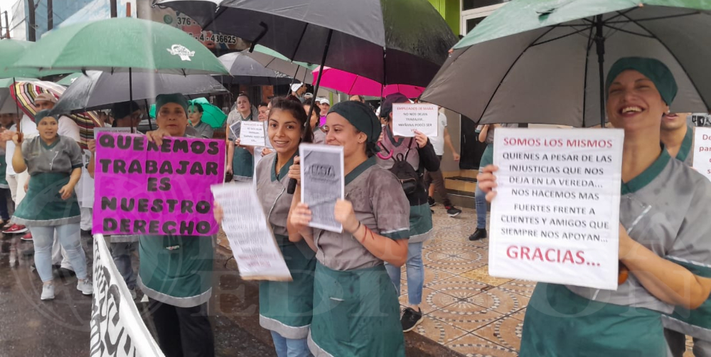 Con la incertidumbre sobre sus lugares de trabajo, bajo una copiosa lluvia, los empleados pudieron volver hoy al comercio para sacar y tirar la materia prima en un contenedor en las puertas del local. Se concentraron con cartelería alusiva y reclamos contra Bromatología. “¡Queremos trabajar, queremos trabajar !”, se escuchó.