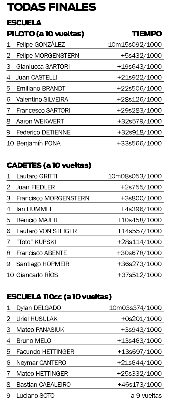 Sobre el resto de las categorías, ya estaban definidas desde antes del fin de semana. En Escuela, el campeón Felipe Morgenstern fue segundo ayer detrás de Felipe González, ganador del día y subcampeón.