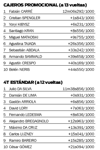Por otra parte, respecto a la categoría más potente, la Estándar, Julio Da Silva no tuvo ayer contrincantes y se quedó con la fecha para asegurarse así el campeonato después de un segundo semestre casi perfecto. Se trata del quinto título para el nuevo monarca, después de dos coronaciones en la 110cc y otras dos en la 10 Hp.