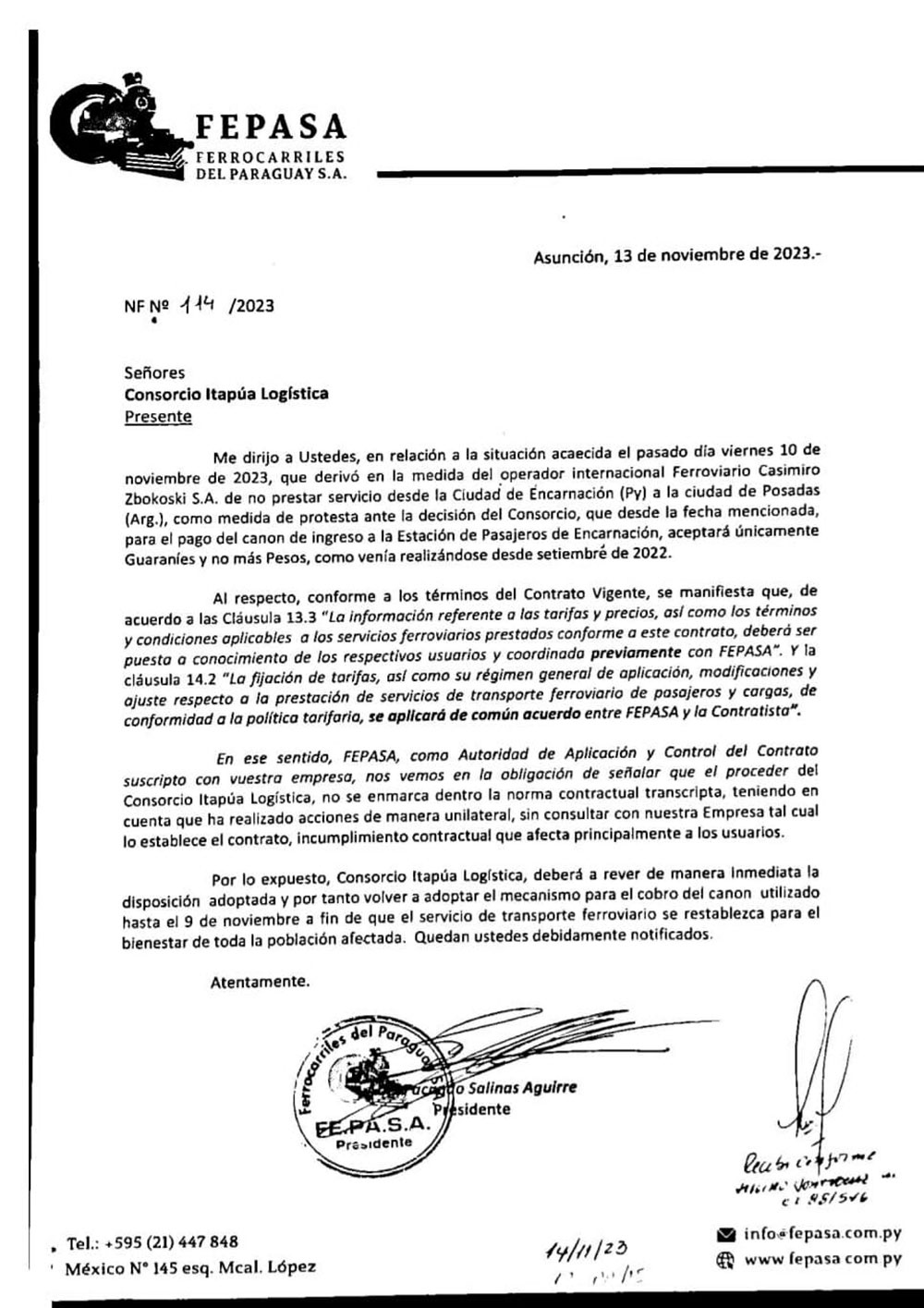 Ferrocarriles del Paraguay le informó a la empresa que tiene la concesión de la estación del lado paraguayo, que ignorar lo notificado este martes supone una violación del contrato. Si persiste podría suponerle el fin de la explotación del apeadero de Encarnación.