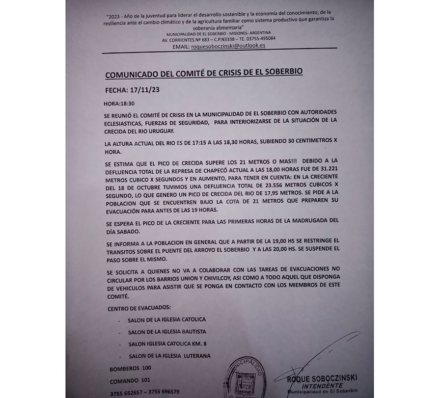 Una vez más quien actualizó la situación de las zonas afectadas y los evacuados fue el intendente de El Soberbio, Roque Soboczinski, en comunicación con FM Santa María de las Misiones este viernes por la tarde.