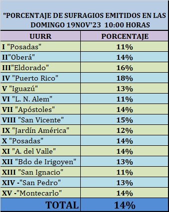 Por jurisdicciones, la Unidad Regional I de Posadas (que había iniciado la jornada como la de menor participación en la provincia) finalmente se convirtió en la que más votantes acumuló, con un 77% del padrón, seguido de la UR-X (que abarca el Sur de Posadas y Garupá) y Montecarlo (UR-XV) con el 76% y Eldorado con el 75%.