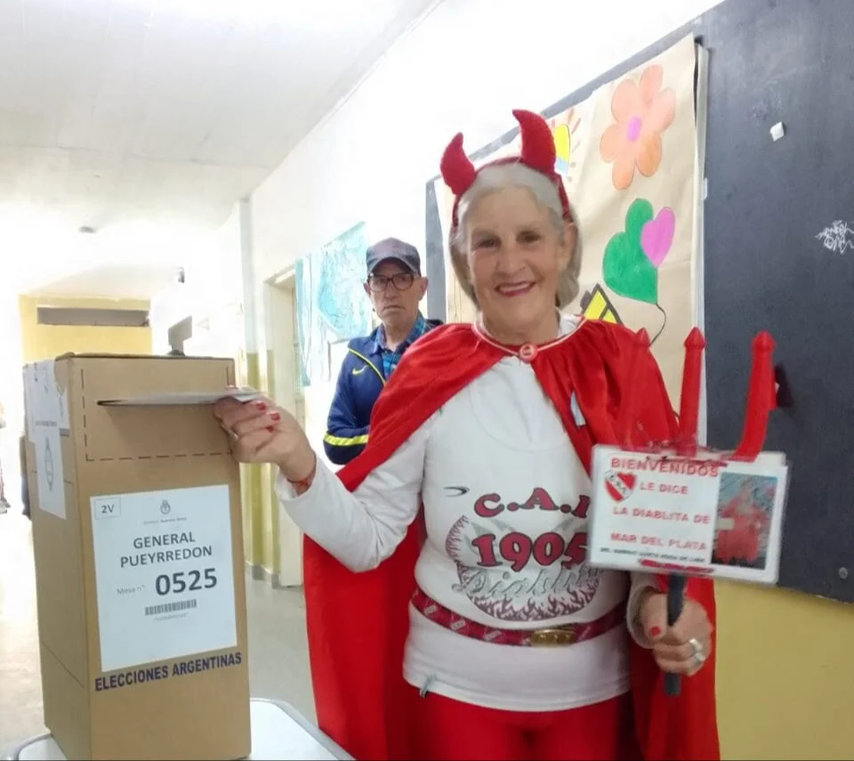María Cristina Pendas, una jubilada de 68 años fanática de Independiente de Avellaneda, emitió su voto con un outfit particular y bastante llamativo: con un disfraz de diabla.
