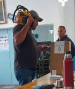 Asimismo, un hombre se acercó a la mesa electoral de la localidad bonaerense de Mones Cazón, en Pehuajó, con una motosierra cargada sobre el hombro.