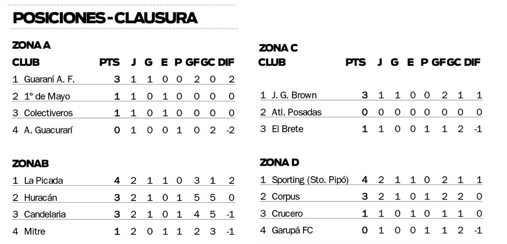 El miércoles, el único juego que se desarrollará será el de Sporting de Santo Pipó vs. Garupá FC; en tanto que serán reprogramados por la Liga los siguientes juegos: Guaraní vs. Colectiveros, 1º de Mayo vs. Guacurarí y Garupá FC vs. Crucero (pendiente de la fecha 2).