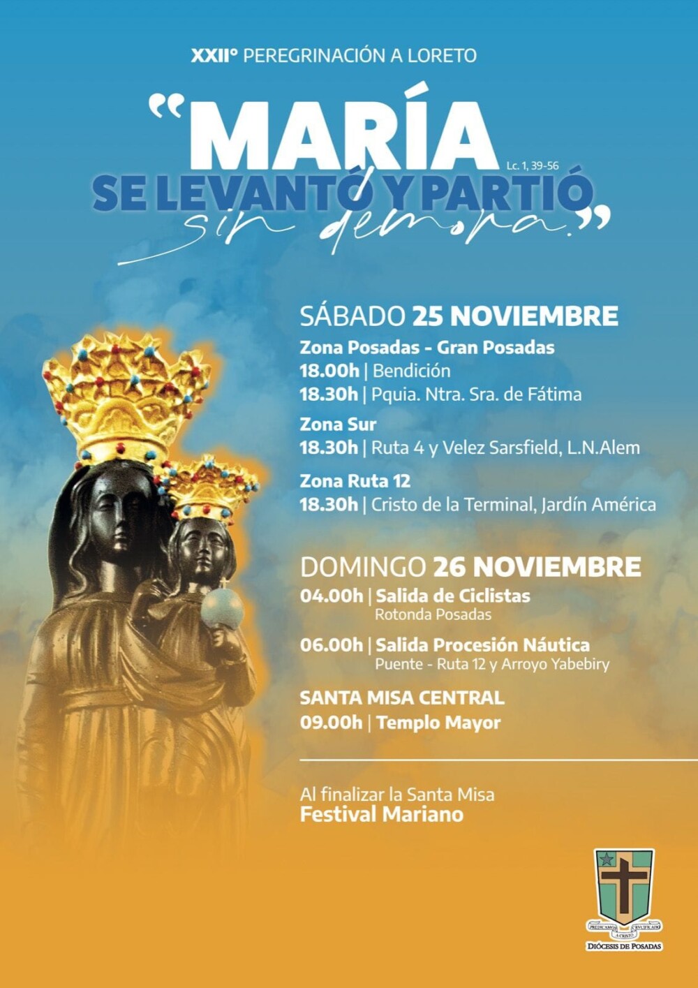 Bajo el lema “María se levantó y partió sin demora”, la Diócesis de Posadas invita a la comunidad a ser parte del recorrido de esta XXII edición que iniciará el sábado 25 por la tarde para los peregrinos caminantes; mientras que las procesiones náutica y de ciclistas tendrán lugar el domingo 26 por la mañana.