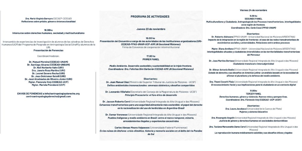 En la apertura, se realizará la presentación del encuentro que estará a cargo de las autoridades de las instituciones organizadoras (URI-CEDEAD-PPAS-UNAM-UCP-AMFJN), donde se firmarán convenios de cooperación interinstitucionales. “Se realizarán debates sobre derecho, multiculturalismo y ciudadanía y cuáles son las nuevas formas de investigar estos temas”, expuso Abinzano.