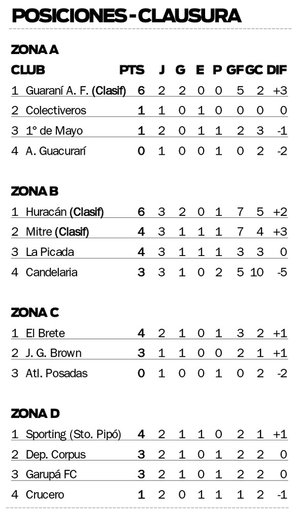 En cuanto al otro match disputado ayer por la tercera fecha del Clausura, Garupá Fútbol Club dio la nota al imponerse sobre Crucero del Norte por 1-0 y ganar terreno en la Zona D, donde ahora quedó tercero y mantiene las chances de clasificación. Aarón Alfonzo marcó el gol de la victoria para los garupaenses, que dejaron así complicado al Colectivero, prácticamente con un pie y medio afuera de la fase final.