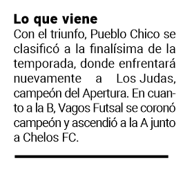 Pueblo Chico, que fue de menor a mayor en el certamen y también había hecho una gran campaña en el Nacional Copa de Plata, cerró así el Clausura en lo más alto. Además, Matías Scheeren finalizó como el máximo goleador del certamen. El podio lo completó La Jotita Futsal, mientras que en el cuarto puesto quedó Atlético Esperanza.