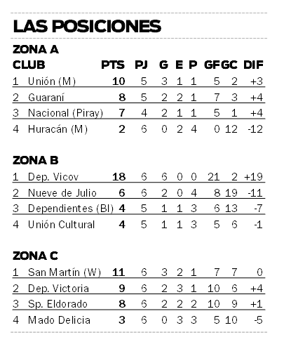 Además, en la Zona C, se dieron dos empates. Sportivo Eldorado y San Martín de Colonia Wanda igualaron 1-1. Alejandro Cabrera marcó para el Albiceleste, mientras que Fabricio Albert lo hizo para el Prócer líder. Por su parte, idéntico resultado se dio en el clásico entre Mado Delicia y Deportivo Victoria.