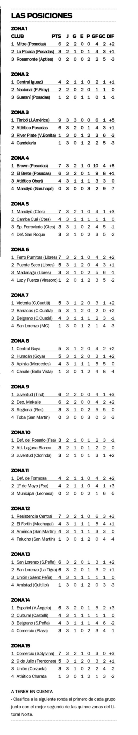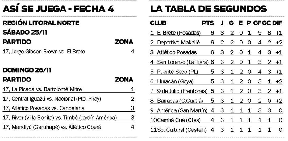 Finalmente, en lo que respecta a la Zona 3, el imparable Timbó de Jardín América -marcha con puntaje ideal- podría dar un paso enorme a segunda ronda este domingo desde las 17 frente a River en Villa Bonita. Es que una victoria lo dejará en la línea de los 12 puntos y obligará al escolta Atlético Posadas a una necesaria victoria sobre Atlético Candelaria en el Tajamar para mantener chances de arrebatarle la primera posición en la recta final de la fase regular.