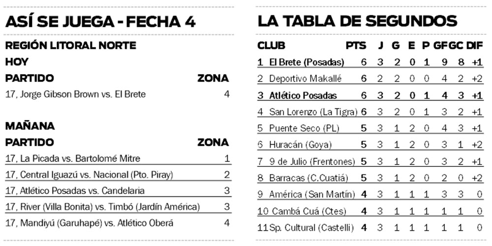 Desde las 17, Jorge Gibson Brown recibirá en Villa Urquiza a El Brete, en la apertura de la cuarta fecha para los equipos misioneros. Será un partido clave para ambos en busca de la clasificación, por la Zona 4. Mañana se disputará el grueso de la fecha para el Litoral Norte.