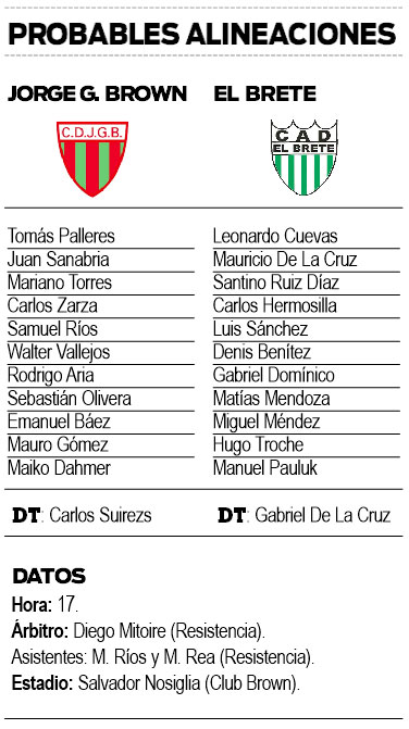 En cuanto a las matemáticas, Brown marcha como líder de la Zona 4 con 7 puntos, escoltado por El Brete, con 6 unidades. El partido de esta tarde será especialmente seguido de cerca por Atlético Oberá, que recién mañana enfrentará al colero Mandiyú en Garuhapé en busca de una victoria que le permita mantener las chances, habida cuenta de que jugará de local en las dos últimas fechas de la fase inicial.