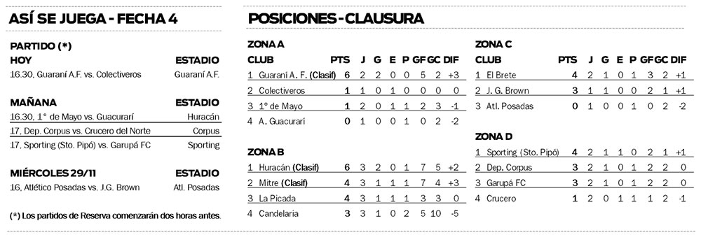 Con el juego que sostendrán hoy Guaraní Antonio Franco y Colectiveros, por la Zona A, se pondrá en marcha la cuarta fecha del Torneo Clausura 2023 de la Liga Posadeña de Fútbol (LPF).