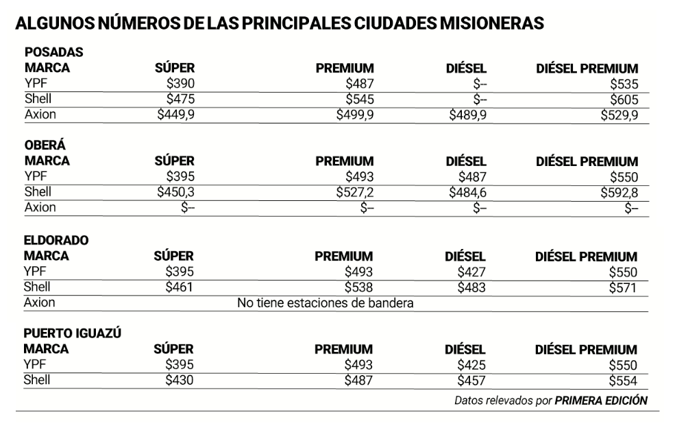 En Oberá, Eldorado, Puerto Iguazú y Apóstoles, los precios son bastante similares entre sí, con una leve variación en el combustible diésel en la ciudad de Cataratas. A saber, la nafta súper quedó en $395 y la premium (Infinia) en $493 el litro. En cuanto al combustible diésel, el común quedó en $427 (salvo Iguazú que está $425) y la Infinia diésel $550 el litro.