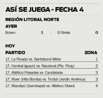 Por último, en Garuhapé, esta tarde por la zona 4, Atlético Oberá visitará al local Deportivo Mandiyú con la idea de sumar los tres puntos para no perderle pisada a los elencos posadeños. El juego comenzará a las 17. El árbitro será Juan Carlos Franco.