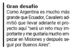 Como Argentina es mucho más grande que Ecuador, admitió que “será un reto muy importante y me gustaría mucho empezar en Misiones y después seguir por Buenos Aires”.