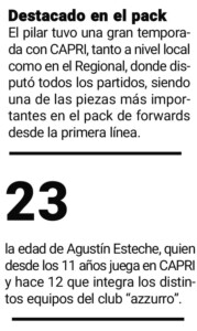 Es importante destacar que Agustín tuvo una gran temporada con CAPRI, tanto a nivel local como en el Regional del Nordeste, donde disputó todos los partidos, siendo una de las piezas más importantes en el pack de forwards desde la primera línea. Respecto a ese punto, el jugador opinó: “No soy de hablar mucho de mí mismo, pero creo que le hice un buen aporte al equipo. Pude cumplir siempre con lo que me pedía el entrenador y eso es una satisfacción”.