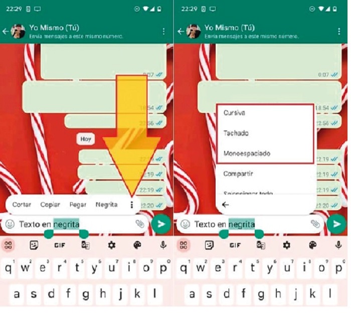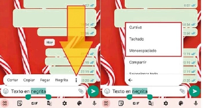 Una opción sencilla es realizar una pulsación larga sobre la palabra o frase deseada, lo que abrirá un menú de opciones. Al seleccionar los tres puntos verticales, se despliegan las alternativas de negrita, cursiva, tachado o monoespacio. Este método es aplicable tanto en Whatsapp como en Telegram.