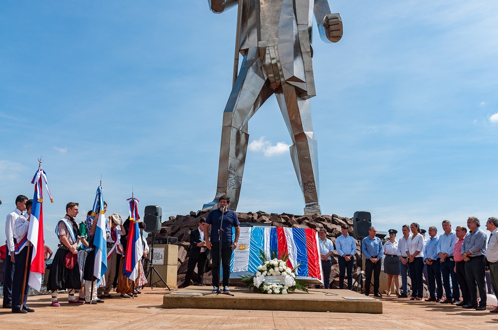 A lo que añadió: “Recordaba al autor de esta obra inmensa que está aquí, Jerónimo Rodríguez, quien me decía que él se inspiró y entendió que tenía que ser una figura muy grande, porque así había sido Andresito para nuestra provincia de Misiones y para la región, y que en lo posible tenía que ser brillante, porque él fue brillante en todas las acciones de su vida. Entonces, por eso concibió de esta manera el monumento. Coincido con esas caracterizaciones”.