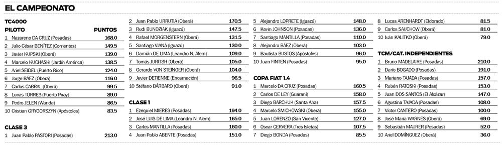Además, en la Clase 1 domina Ezequiel Mieres, aunque se mantendrá atento a José Luis De Lima y Carlos Mantilla, sus más inmediatos perseguidores. En cuanto a la Copa Fiat 1.4, la pelea promete tener un desenlace de película: Marcelo Da Cruz manda pero con escasa diferencia por delante de Carlos De Ley, Diego Barchuk y Marcelo Smichowski. Show.