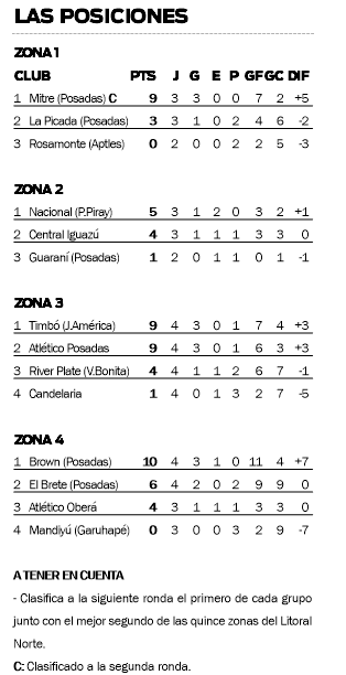 Por su parte, en la Zona 4, Atlético Oberá tendrá un duelo clave ante Brown, que irá en busca de un triunfo para sellar la clasificación a la siguiente instancia. En el mismo grupo, El Brete y Mandiyú de Garuhapé disputará hoy el juego suspendido de ayer a raíz del temporal. El equipo de La Ribera tiene que ganar y esperar que Brown no lo haga para seguir con chances.