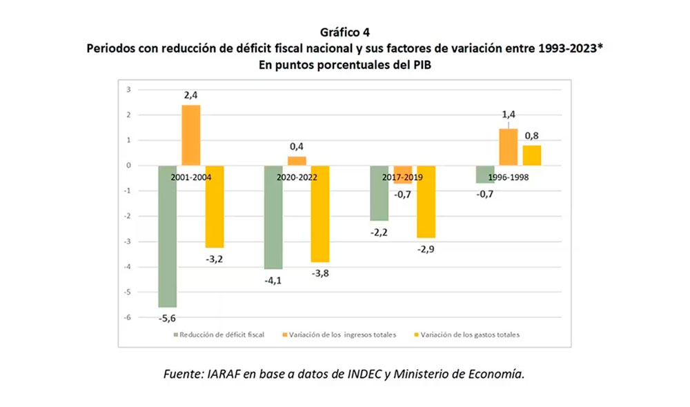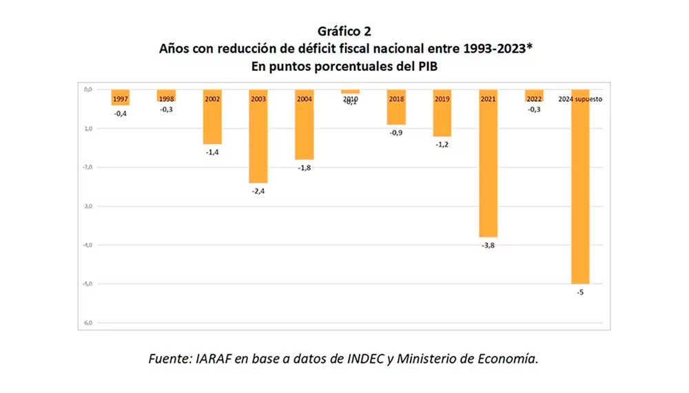 Un estudio del Instituto Argentino de Análisis Fiscal (Iaraf), en exclusiva para Infobae, hizo ese ejercicio para las últimas tres décadas. La conclusión rápida es que en ninguna ocasión el sector público recortó 5% del Producto Bruto de su déficit en un solo año. Sería, de concretarse, el ajuste fiscal más duro en tres décadas.