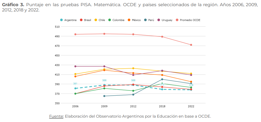 Al respecto, el Observatorio Argentinos por la Educación, tomando los resultados de PISA 2022, informó que los estudiantes argentinos obtuvieron 378 puntos en Matemáticas, un punto menos que en la edición previa (2018) y casi 100 puntos menos de lo que obtienen, en promedio, los países que integran la Organización para la Cooperación y el Desarrollo Económicos (472).