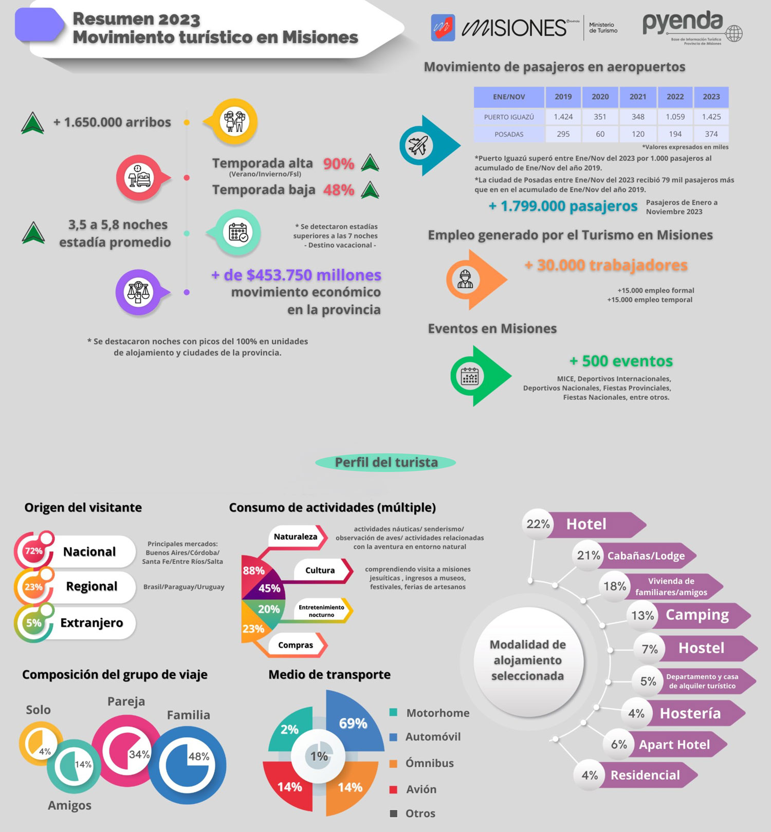 Entre enero y noviembre, la llegada de turistas a Misiones dejó un promedio de $453.750 millones inyectados en la economía local. Con más de un millón y medio de arribos en este año, la estadía promedio por visitantes fue de 3,5 a 5,8 noches, además de detectar estadías que superaron las 7 noches en temporada alta. En cuanto al alojamiento, aseguran que llegaron a picos del 100% de ocupación en alojamientos en diferentes localidades.