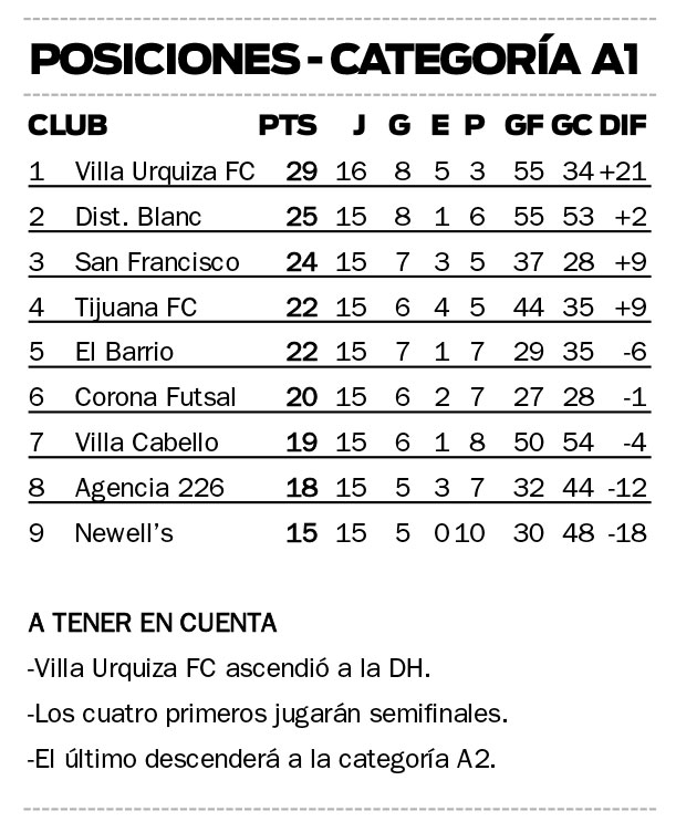 En ese sentido, la pelea es más que pareja. Hasta el momento solo Villa Urquiza y Distribuidora Blanc tienen un lugar asegurado en semis. Las otras dos plazas serán el objetivo de lucha para otros cinco equipos.