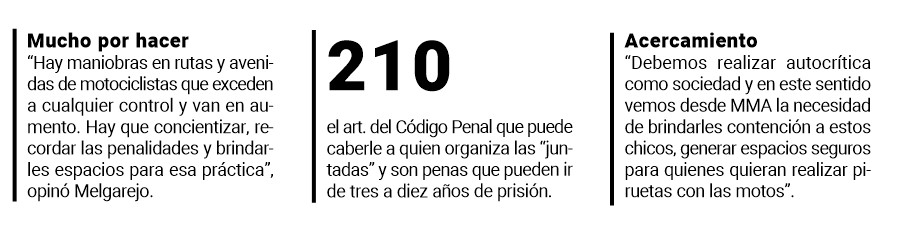 Melgarejo recordó que “debemos partir de la base que hay requisitos para circular y que si el motociclista incumple eso implica la retención preventiva del motovehículo. Debemos sumar que por el simple hecho de convocar, administrar grupos destinados a estas actividades o participar de eventos ilegales como el ‘DominGrau’ están incurriendo en varios delitos, lo cual es más grave aún y ya estamos hablando incluso de prisión para los organizadores y sus convocados que muchas veces por desconocimiento participan. Esto no lo decimos con animosidad de nada, es lo que dice la ley y hay que cumplirla”.
