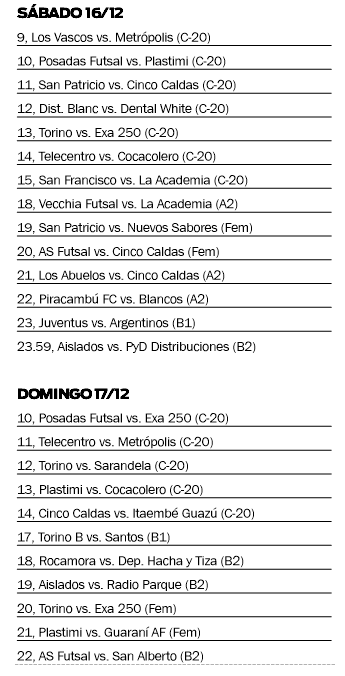 En tanto, desde las 22 será el turno de Agencia 226 y Tijuana, por la A1 (Segunda); mientras que a las 23 el puntero de la A2, Sinaloa, chocará ante CAPRI Futsal. La jornada se cerrará con el duelo entre 250 Futsal y Argentinos B, en lo que será la revancha de octavos de final de la categoría D: en la ida, los últimos ganaron por 3-2.