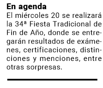 Como cierre de actividades, el miércoles 20 se realizará la 34ª Fiesta de Fin de Año, donde se entregarán resultados de exámenes, certificaciones, distinciones y menciones, entre otras sorpresas, indicaron desde la institución.