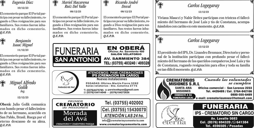 Fúnebres del Jueves 14 de Diciembre de 2023