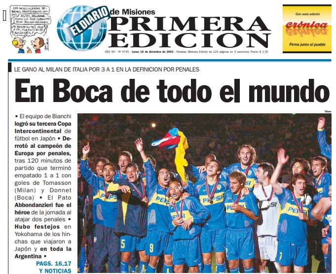 Apenas dos años después de haber cosechado ese mismo título frente al todopoderoso Real Madrid, el equipo de Carlos Bianchi se consagró ante otro equipo lleno de estrellas: el AC Milán italiano, de Ricardo Kaká, Paolo Maldini, Andrea Pirlo, Adriy Shevchenko, Cafú y muchas más figuras.