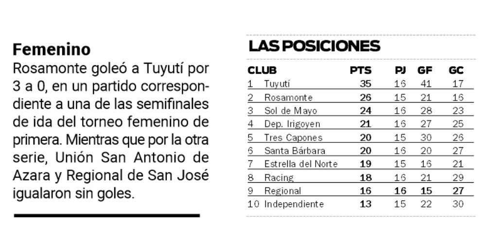 Los otros resultados registrados por esta misma fecha: Deportivo Rosamonte superó a Sol de Mayo por 1 a 0. Mientras que Regional, en San José derrotó 2 a 1 a Tres Capones.