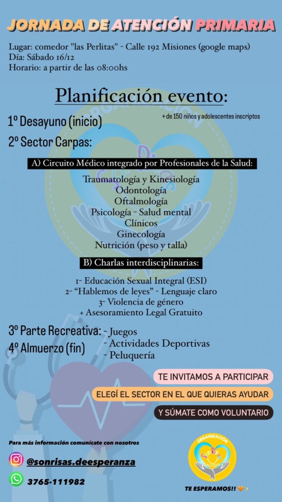 Desde la organización “Sonrisas de Esperanza” organizaron una jornada de atención primaria integral que llevará no solo juegos y alimentos para los niños, sino también chequeos médicos.