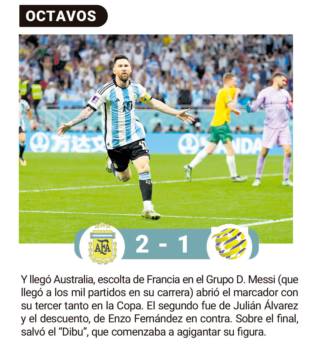 Con esa angustia, la Selección encaró la prórroga pero el equipo la asimiló con entereza ante un rival motivado por la hazaña. Messi recuperó la ventaja con su segundo gol personal, un 3-2 que sí parecía definitivo pero que se desvaneció diez minutos más tarde por una mano sin intención de Gonzalo Montiel en el área.