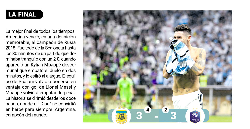 La final del 18 de diciembre en el estadio de Lusail tuvo todos los ingredientes: la presencia de Lionel Messi, el mejor jugador del mundo; la amenaza del heredero del trono, Kylian Mbappé; el enfrentamiento entre las dos selecciones que mejor habían jugado en el Mundial; la superioridad aplastante de un equipo hasta el minuto 80, una reacción impensada del campeón herido; la atajada épica del “Dibu” Martínez para evitar la catástrofe y finalmente un desenlace feliz para Argentina en los penales.