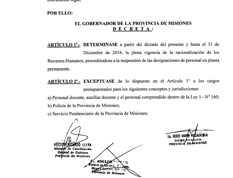 Primero emitió un decreto por el cual controlará como cabeza de la Comisión de Contención del Gasto, hasta a los entes autárquicos en sus movimientos financieros. Ahora, el gobernador Hugo Passalacqua decidió el congelamiento de los pases a planta permanente en la Administración Pública provincial por un año, es decir, hasta el 31 de diciembre de 2024.