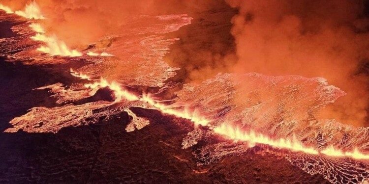 La actividad volcánica abrió una fisura de 4 kilómetros (2,5 millas) de la que surgieron fuentes de lava, pero un comunicado del gobierno islandés dijo que la erupción no representaba una amenaza para la vida. Entre 100 y 200 metros cúbicos de lava emergieron por segundo, varias veces más que en erupciones anteriores en el área, anunció la Oficina Meteorológica.