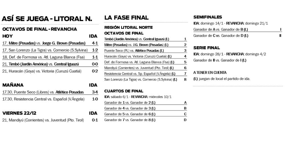 En cuanto al quinto y último misionero clasificado a octavos, Atlético Posadas jugará recién mañana en Paso de los Libres ante Puente Seco. Los encabezados por el ex Independiente Juan Eluchans buscarán mantener la diferencia que les significó haber ganado por 4-3 en la ida para meterse en la próxima instancia.