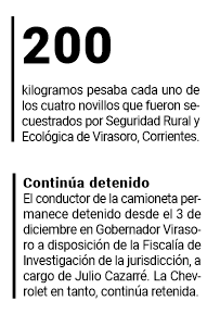 Las mismas voces señalaron que en el cruce de las calles Carlos Farina y Mburucuyá, en el barrio Presidente Raúl Alfonsín, de Virasoro, secuestraron una camioneta Chevrolet S-10 y que el conductor no presentó ningún documento, aval o versión que explique el traslado en plena madrugada de la carne vacuna. No pudo acreditar la propiedad de los animales, el permiso de faena y, menos aún, los controles sanitarios requeridos ante la flagrancia de la infracción a las normas bromatológicas.