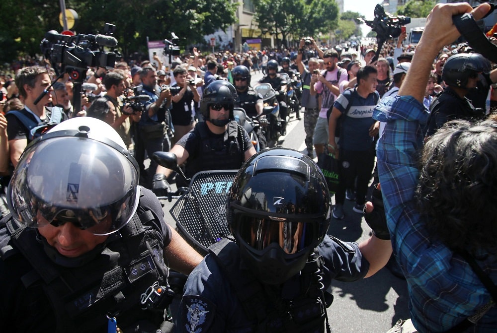 Cerca de las 16 horas, un grupo que marchaba por Diagonal Norte se cruzó fuertemente con agentes de la Policía de la Ciudad. Del hecho, quedaron detenidos dos manifestantes por agresiones al personal, según informaron fuentes oficiales de la fuerza.