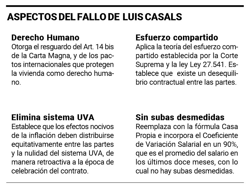 “Por el contrario, en el caso del juez federal José Luis Casals, cuando toma el juicio y pasa sentencia, sintéticamente lo que establece es que no importa la relación cuota-ingreso de los tomadores, porque si no tendríamos que ver la capacidad económica del banco. Para él lo que importa es analizar objetivamente el sistema UVA en el contexto inflacionario de hoy”, dijo.