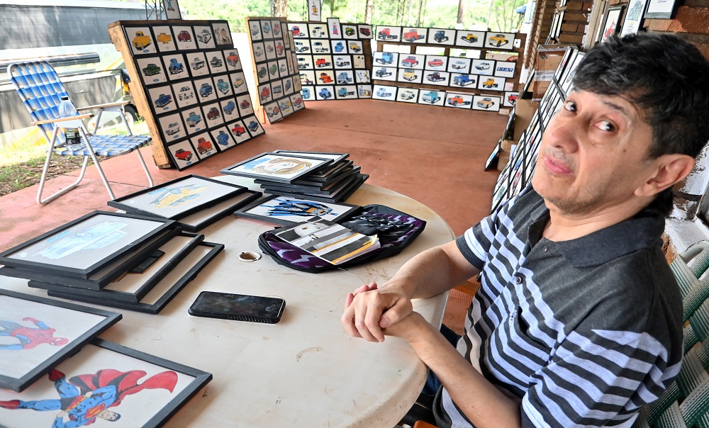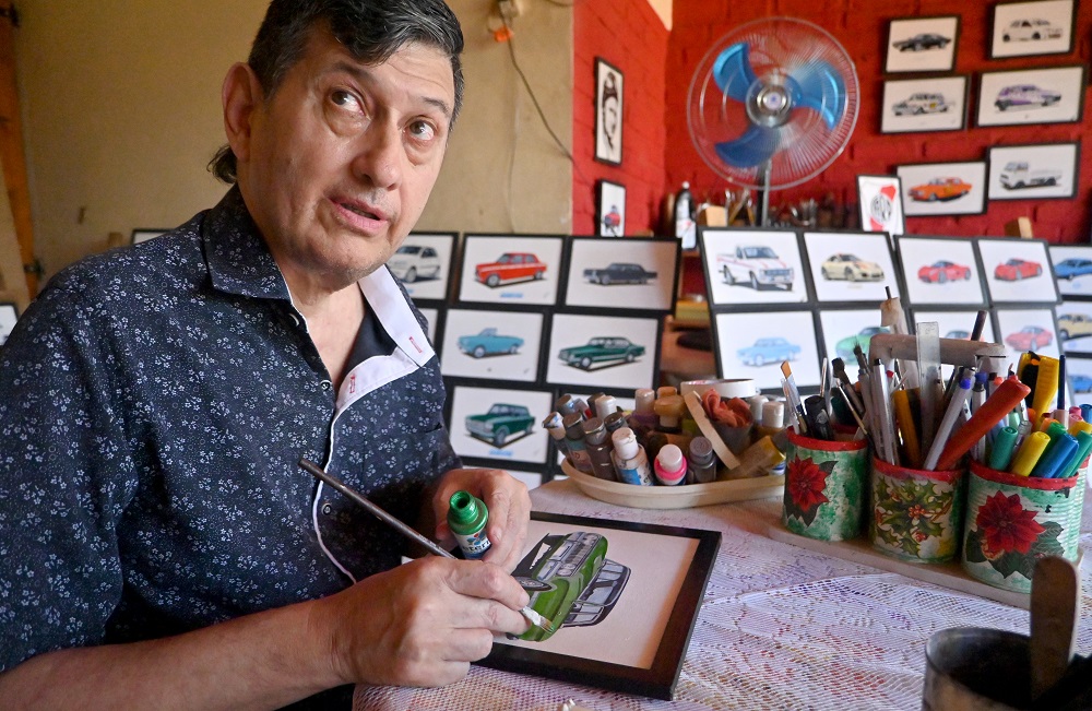 “Hasta los 50 y tantos nunca hice nada. No pintaba, nada. Dilapidaba mi tiempo mirando televisión o jugando en la play. Me había dado un ACV y la psicóloga me dijo que hiciera algo, que ocupara mi tiempo en algo más útil, en otras cosas, por ejemplo, en pintar. La palabra resonó en mis oídos y al poco tiempo puse manos a la obra e intenté hacer unos cuadros de animales, así como empieza la mayoría. Mi amigo Ángel, que es tatuador, me dijo: ‘Lo tuyo son los autos, que a vos te salen bien. Dedicate a eso’. Como también pinta, cuando venía a visitarme, me hacía algunas correcciones”, manifestó, quien nació en Campo Ramón; siendo niño se trasladó a Villa Svea junto a su familia, y ahora reside en Villa Barreyro.
