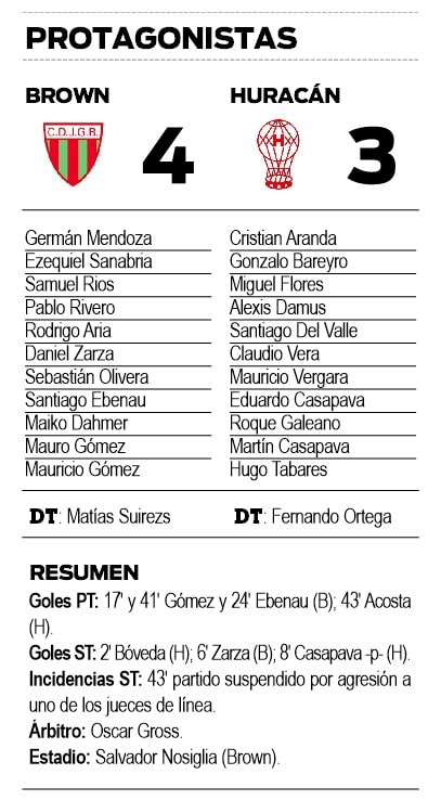 Brown y Huracán disputaban un partidazo de semifinales, pero lastimosamente el juego no terminó. El local ganaba 4-3 en el epílogo, pero un proyectil impactó en uno de los jueces de línea y el partido se suspendió. La última palabra la tendrá el Tribunal