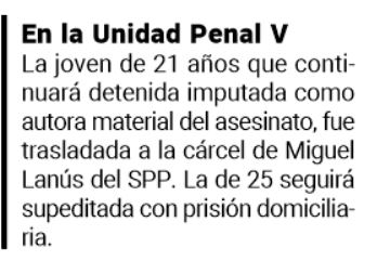 Respecto a la primera, permanece con prisión domiciliaria debido a que cursa un embarazo avanzado. La que tiene 21 años, y es señalada en la investigación como la posible autora material del hecho, fue trasladada al Correccional de Mujeres de Villa Lanús. El tercer acusado se encuentra en libertad pero supeditado a la causa.