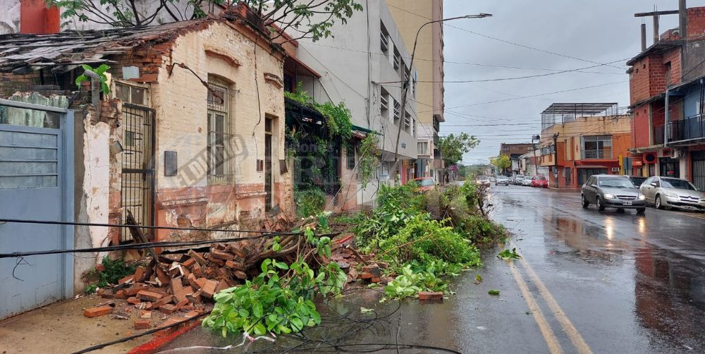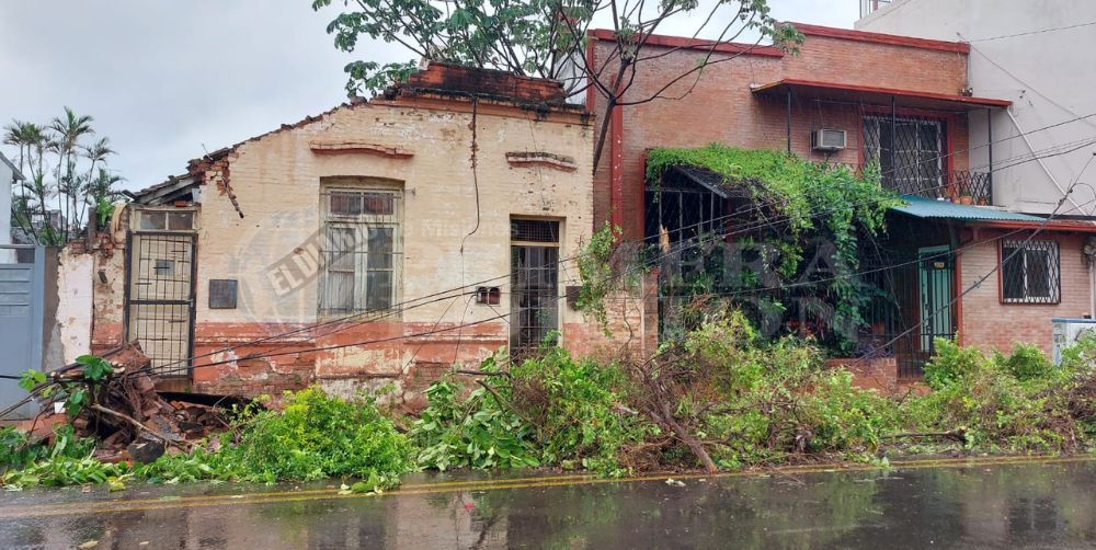 Según pudo saber este medio en diálogo con vecinos del lugar, un árbol que creció en la cornisa de esta vivienda no soportó los fuertes vientos y cayó en la mañana de hoy, arrastrando consigo una gran cantidad de ladrillos y afectando el tendido eléctrico de la cuadra.