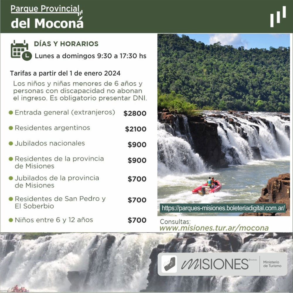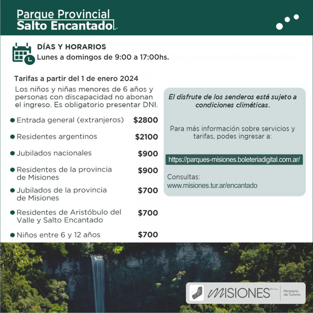 El Ministerio de Turismo de Misiones informó que a partir de este 1º de enero del 2024 entra en vigencia una actualización en las tarifas de ingreso a los parques provinciales.